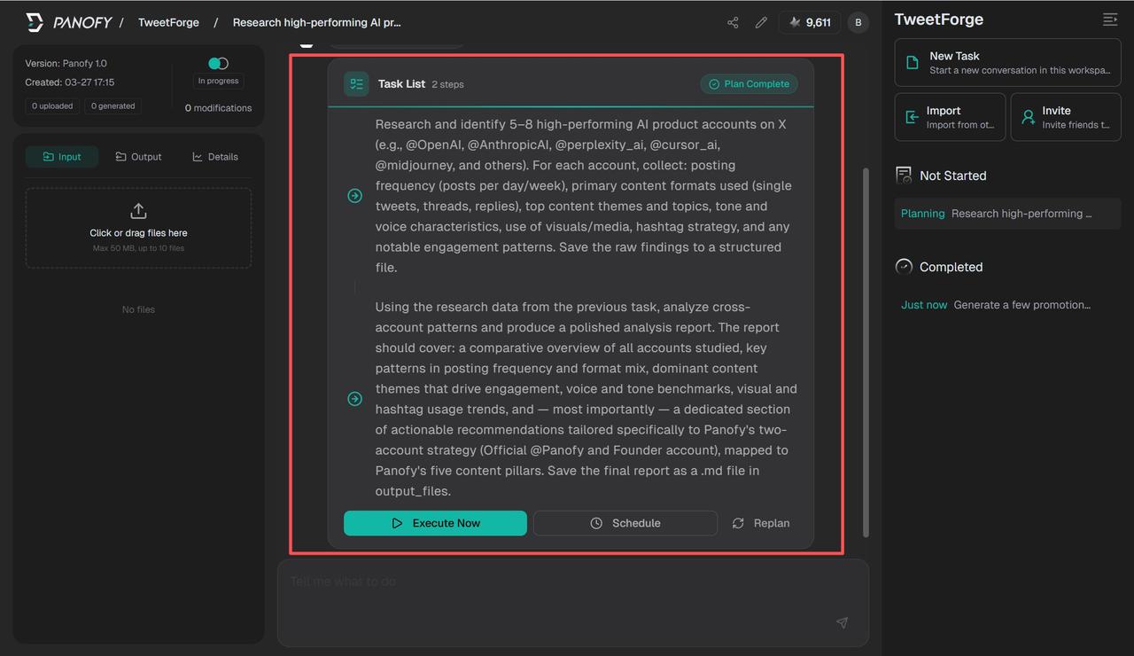 Agent auto-generates a task plan — supports immediate / scheduled execution or replanning