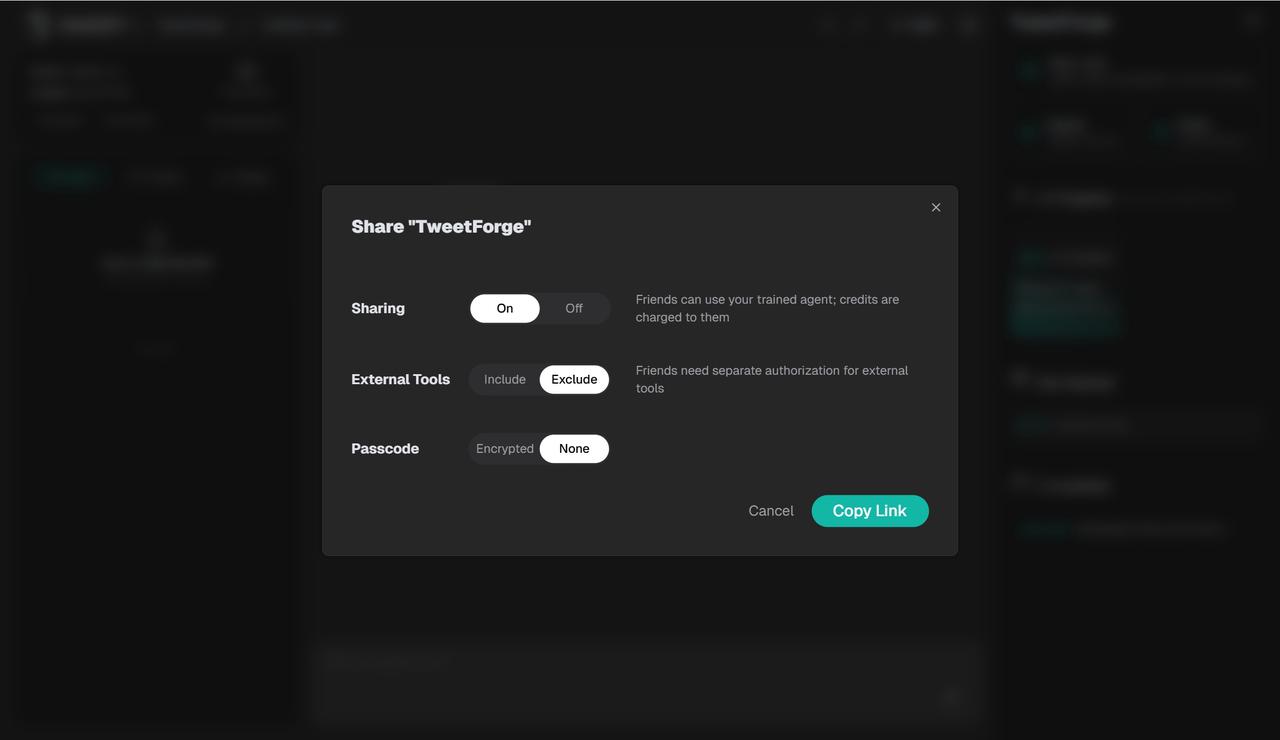 Click "Invite" in the right-hand navigation bar to generate an invite link. Anyone with the link can use your trained agent directly, with any credits consumed charged to their own account. You can configure whether to include access to external tools and whether to require a passcode.