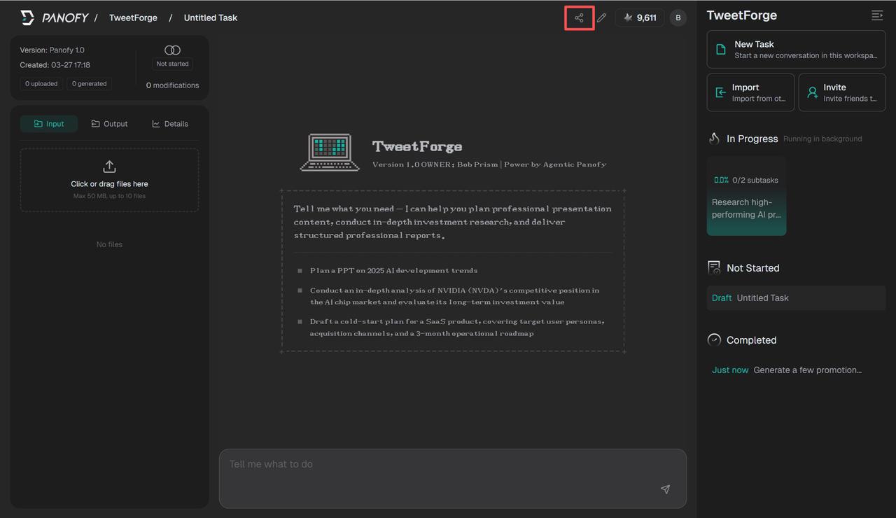 Click "Import" in the right-hand navigation bar to bring in an existing task plan from another complex task. This allows established workflows to be saved and reused directly.