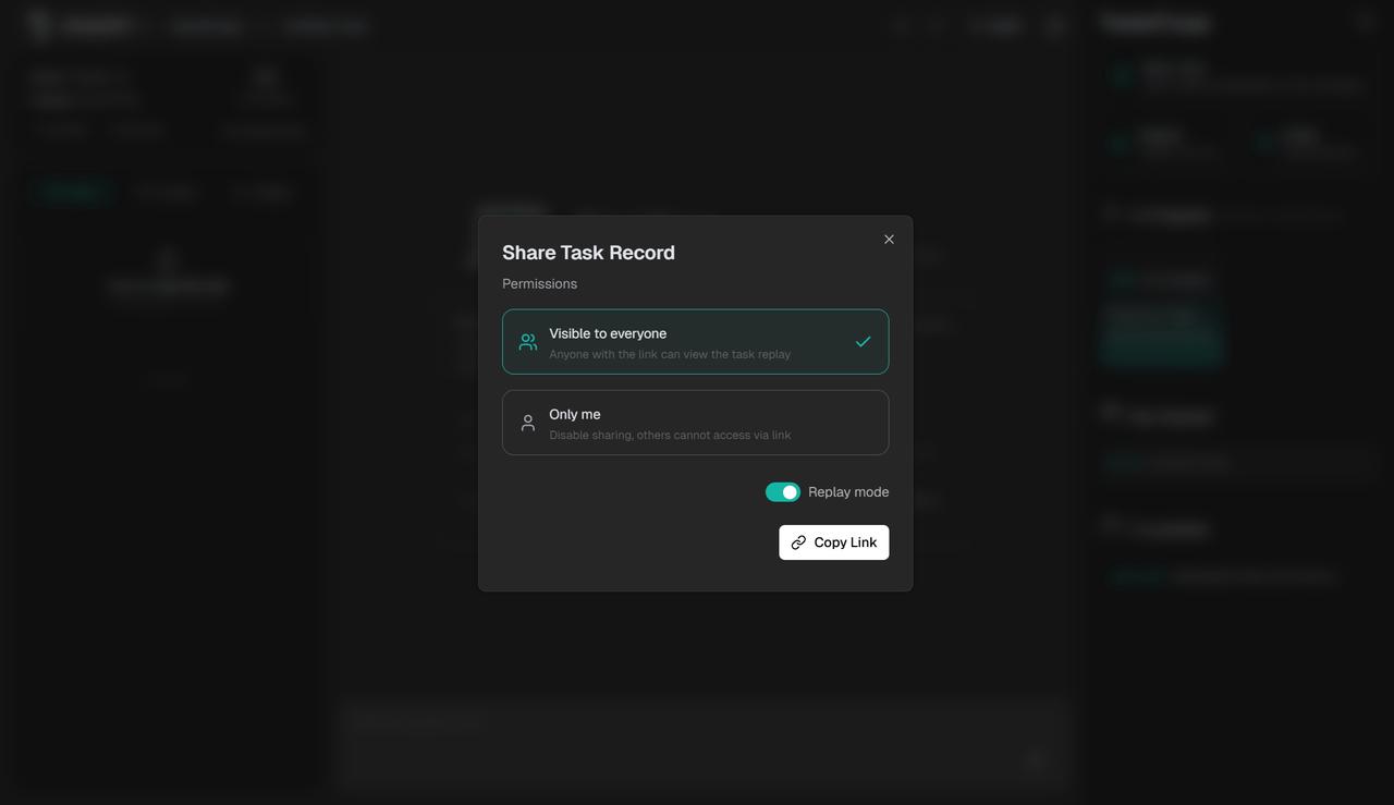 Click the share icon above the conversation to generate a shareable link for the task record. You can set visibility to "Anyone with the link" or "Only me", and optionally enable playback mode so external viewers can replay the task without needing to register.