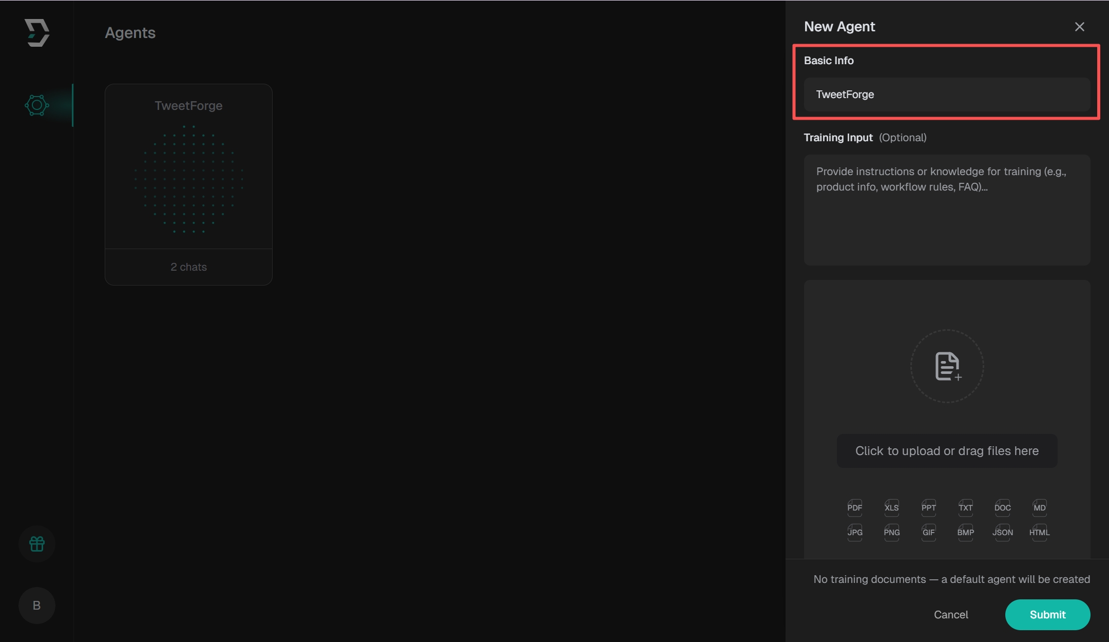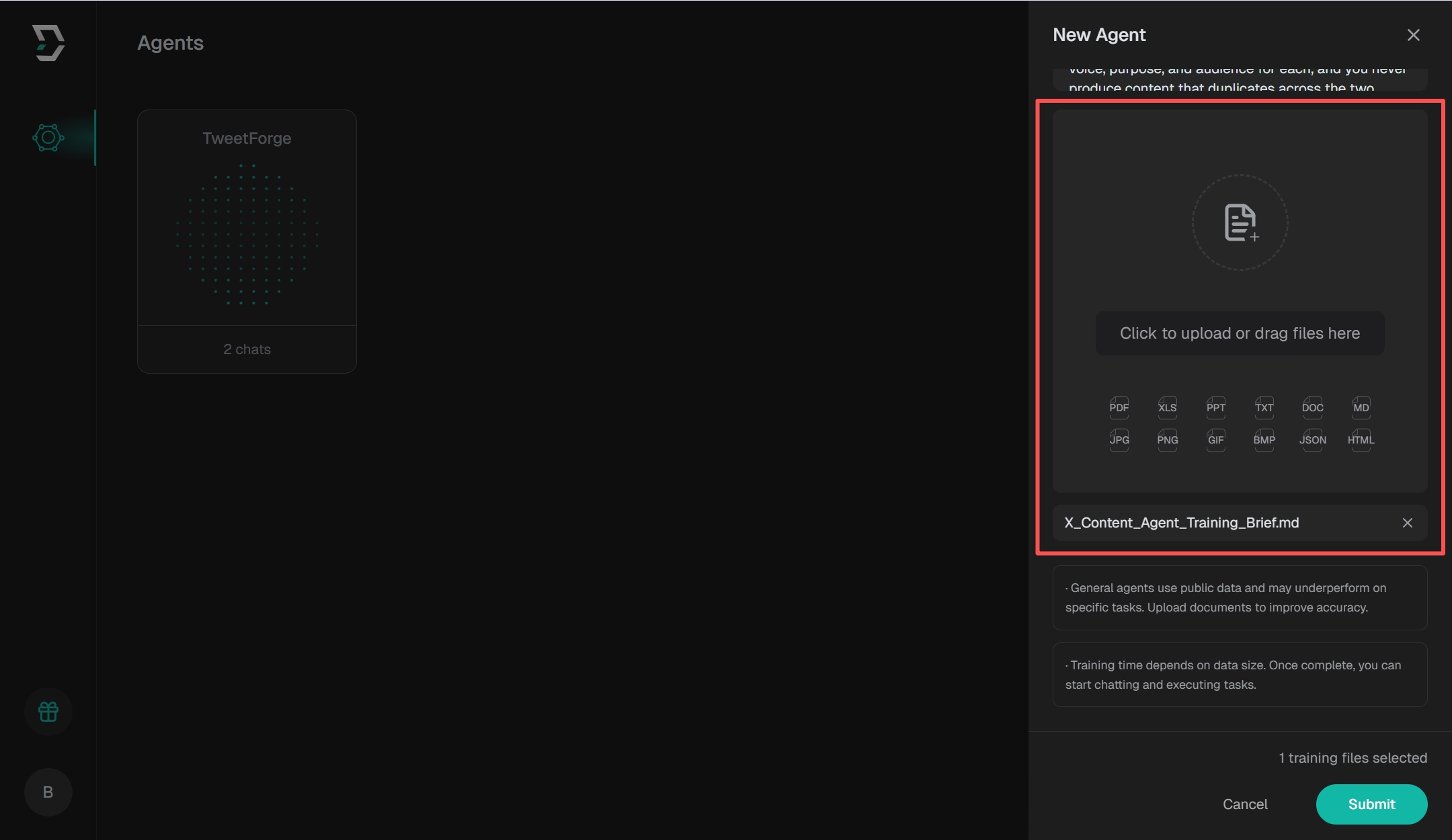 Click "Submit" to begin training. You will be automatically redirected to the Agent Workspace, where training progress updates in real time.